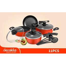 Lot de 11 pièces d’ustensiles de cuisine : 3 casseroles et couvercles + 1 poêle + 4 spatules.