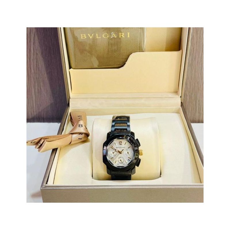 Montre Bvlgari Aluminium Chronograph avec mouvement de manufacture mécanique, remontage automatique, chronographe, boîtier de 41 mm en aluminium sablé, lunette et bracelet en caoutchouc. Étanche jusqu’à 100 mètres.