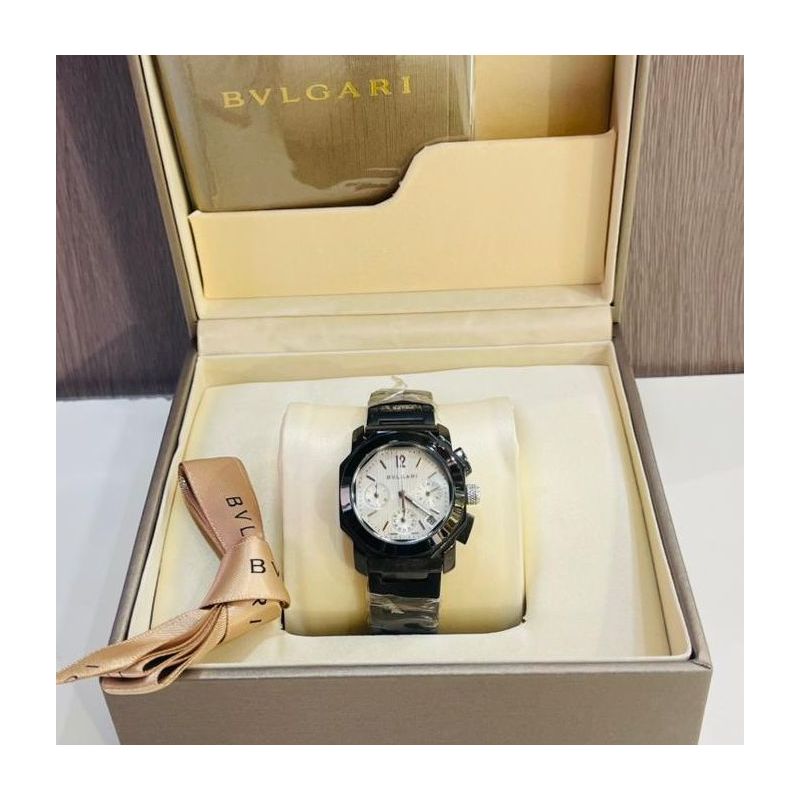 Montre Bvlgari Aluminium Chronograph avec mouvement de manufacture mécanique, remontage automatique, chronographe, boîtier de 41 mm en aluminium sablé, lunette et bracelet en caoutchouc. Étanche jusqu’à 100 mètres.